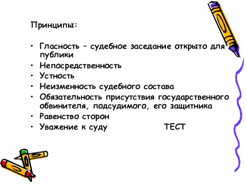 Принципы:Гласность – судебное заседание открыто для публикиНепосредственностьУстностьНеизменность судебного составаОбязательность присутствия государственного обвинителя, подсудимого, его защитникаРавенство сторонУважение к
