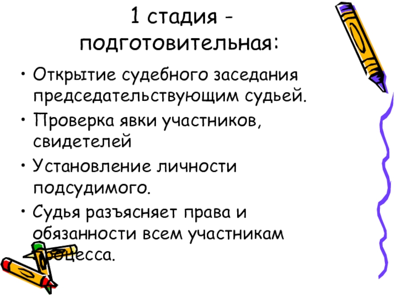 1 стадия - подготовительная:Открытие судебного заседания председательствующим судьей.Проверка явки участников, свидетелейУстановление личности подсудимого.Судья разъясняет права и