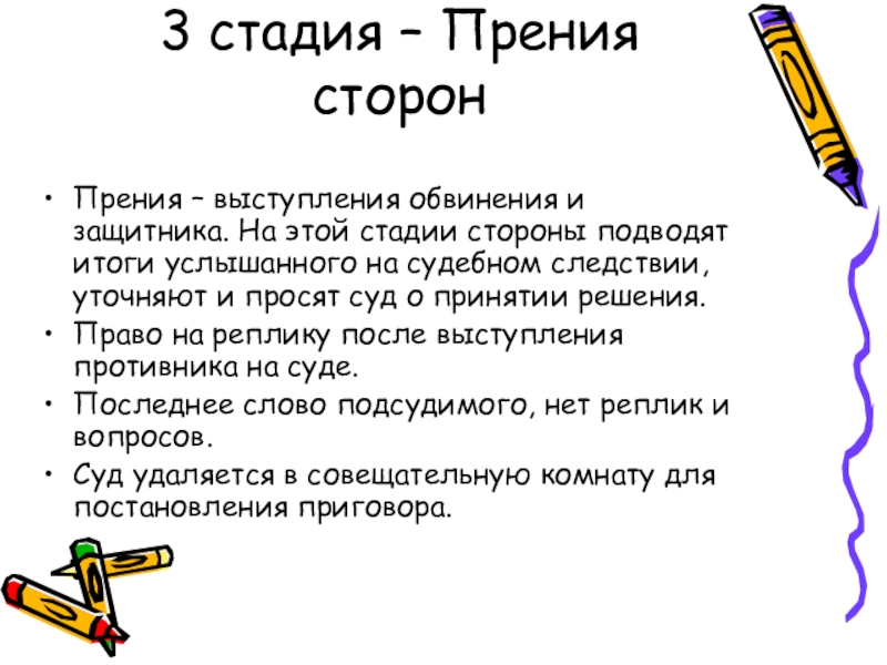 3 стадия – Прения сторонПрения – выступления обвинения и защитника. На этой стадии стороны подводят итоги услышанного