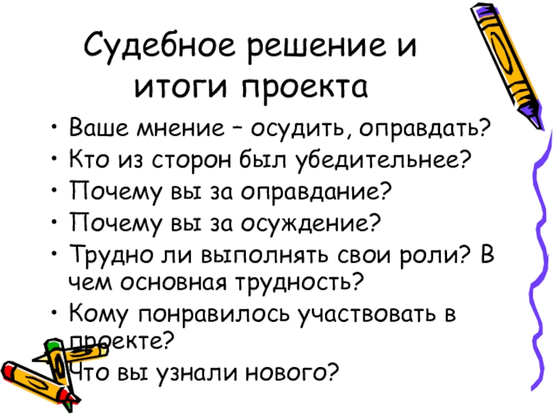 Судебное решение и итоги проектаВаше мнение – осудить, оправдать?Кто из сторон был убедительнее?Почему вы за оправдание?Почему вы