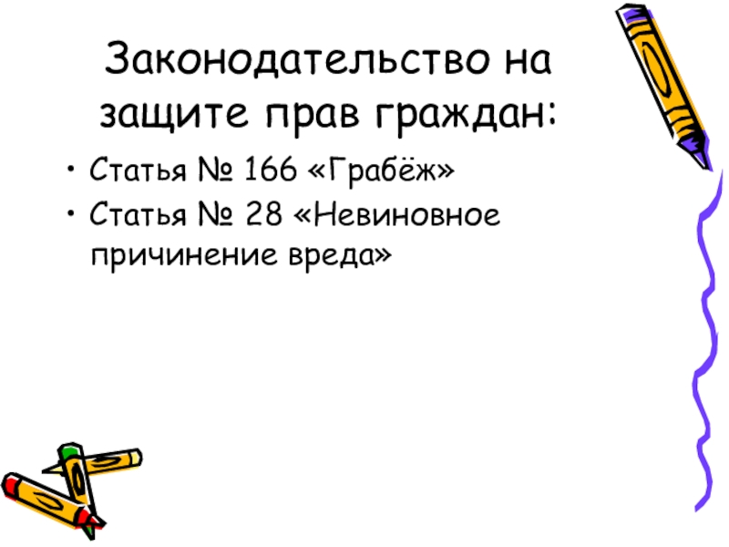 Законодательство на защите прав граждан:Статья № 166 «Грабёж»Статья № 28 «Невиновное причинение вреда»