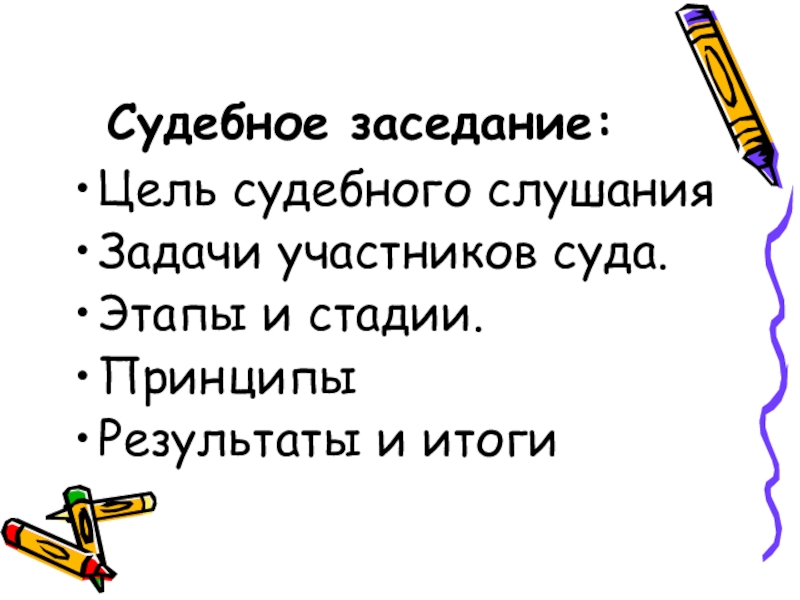 Судебное заседание:Цель судебного слушания Задачи участников суда. Этапы и стадии.Принципы Результаты и итоги