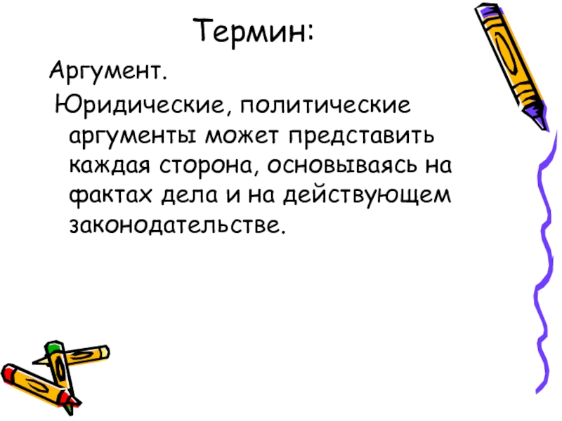 Термин:Аргумент. Юридические, политические аргументы может представить каждая сторона, основываясь на фактах дела и на действующем законодательстве.