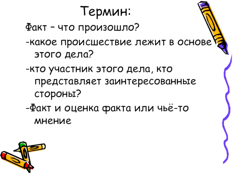 Термин:Факт – что произошло?-какое происшествие лежит в основе этого дела?-кто участник этого дела, кто представляет заинтересованные стороны?-Факт