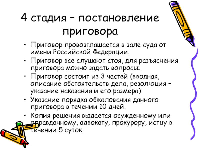 4 стадия – постановление приговораПриговор провозглашается в зале суда от имени Российской Федерации.Приговор все слушают стоя, для
