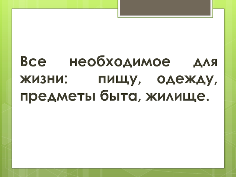 Слайд 8Все необходимое для жизни: пищу, одежду, предметы быта, жилище.