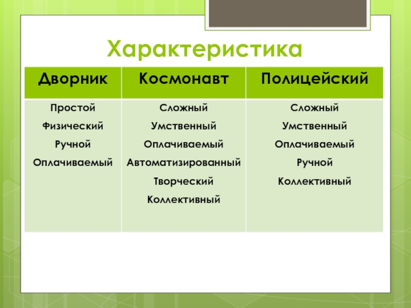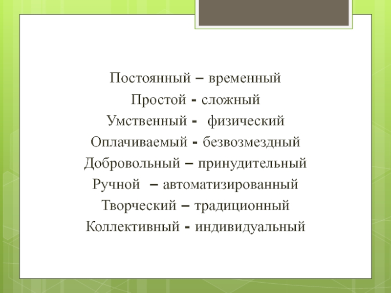 Постоянный – временныйПростой - сложныйУмственный - физическийОплачиваемый - безвозмездныйДобровольный – принудительныйРучной – автоматизированныйТворческий – традиционныйКоллективный - индивидуальный