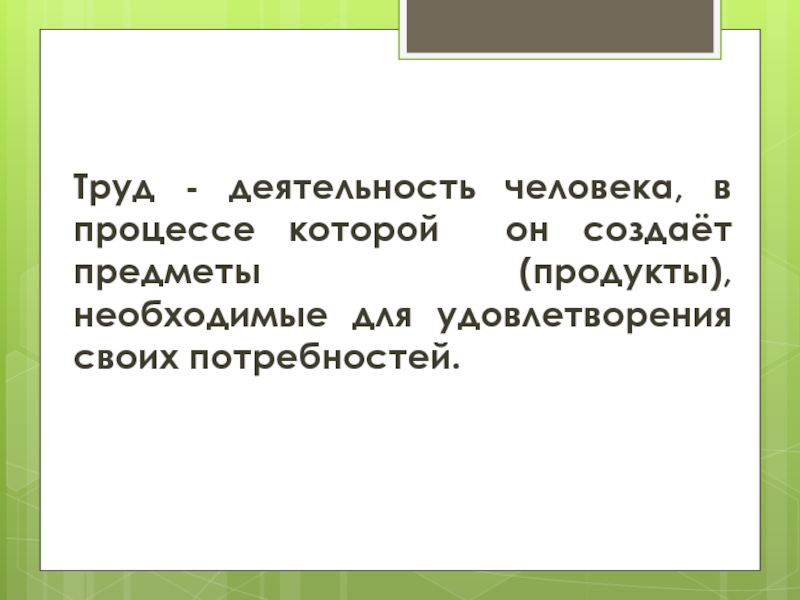 Труд - деятельность человека, в процессе которой он создаёт предметы (продукты), необходимые для удовлетворения своих потребностей.