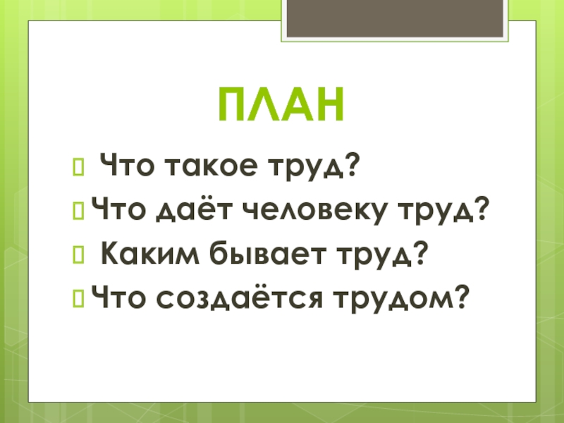 ПЛАН Что такое труд?Что даёт человеку труд? Каким бывает труд?Что создаётся трудом?