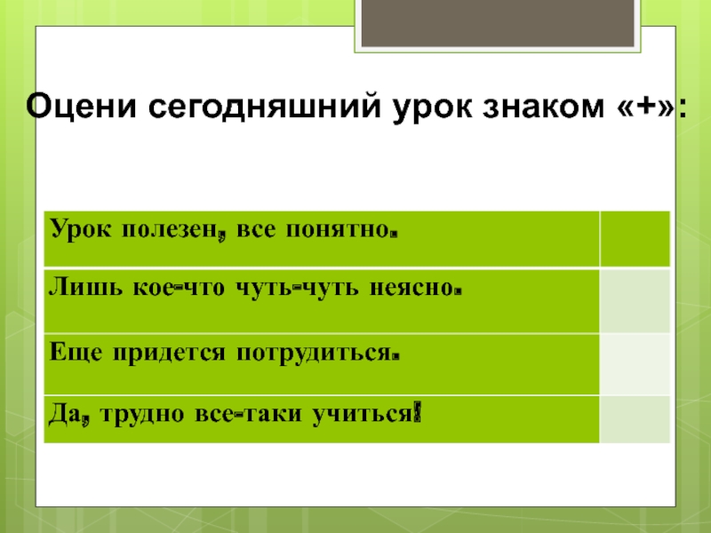 Слайд 15Оцени сегодняшний урок знаком «+»: