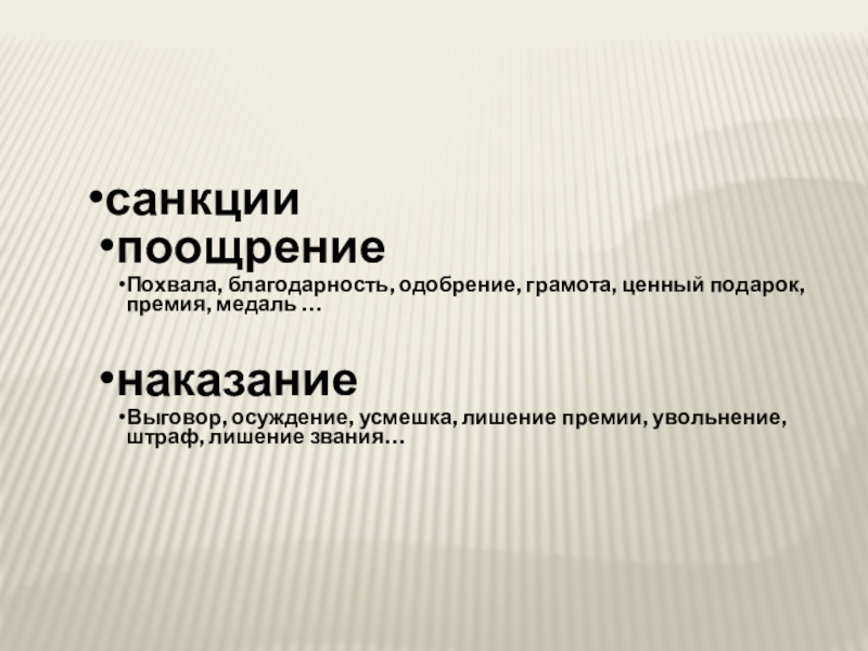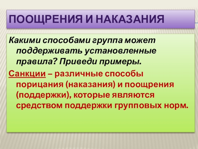– различные способы порицания (наказания) и поощрения (поддержки), которые являются средством поддержки групповых норм.