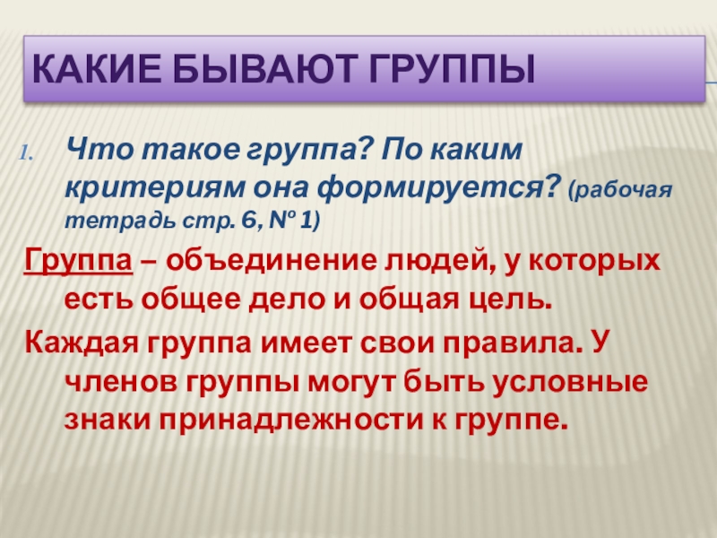 Группа – объединение людей, у которых есть общее дело и общая цель.