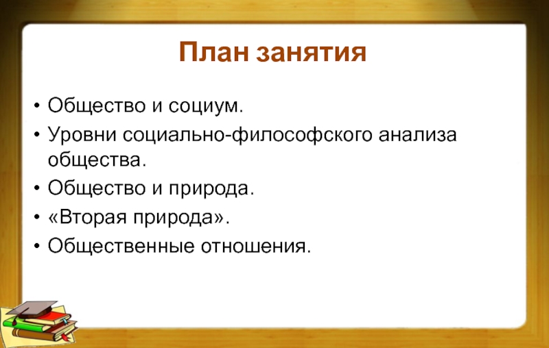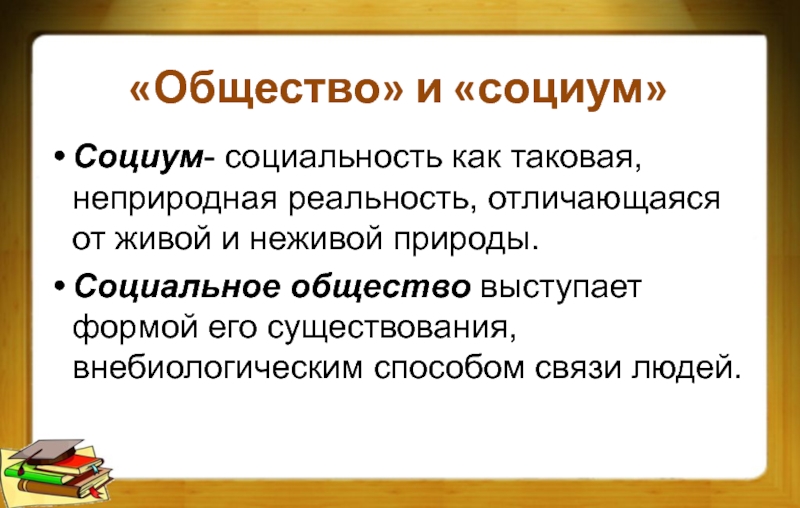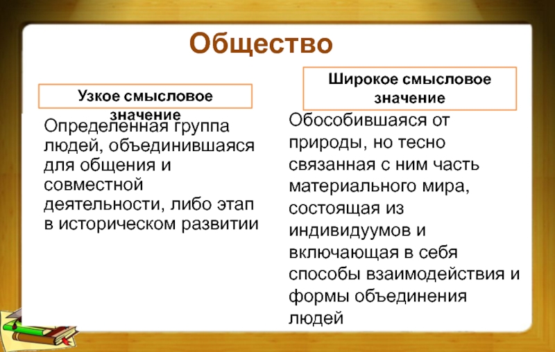 Обособившаяся от природы, но тесно связанная с ним часть материального мира, состоящая из индивидуумов и включающая в себя способы взаимодействия и формы объединения людей