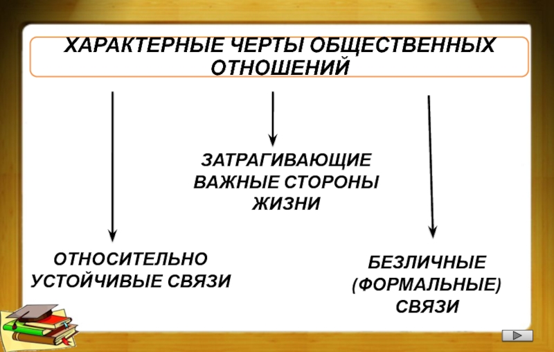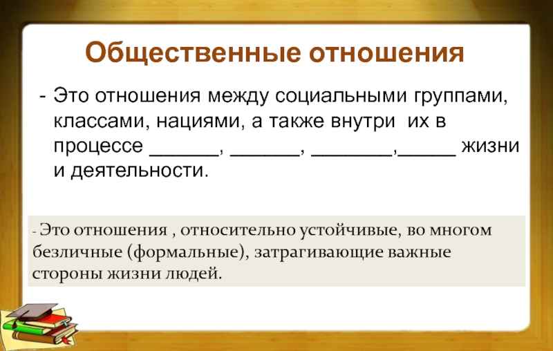 - Это отношения , относительно устойчивые, во многом безличные (формальные), затрагивающие важные стороны жизни людей.
