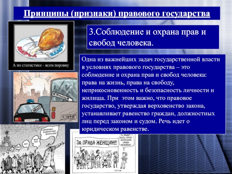 важнейших задач государственной власти в условиях правового государства – это соблюдение и охрана прав и свобод человека: права на жизнь, права на свободу, неприкосновенность и безопасность личности и жилища. При этом важно, что правовое государство, утверждая верховенство закона, устанавливает равенство граждан, должностных лиц перед законом и судом. Речь идет о юридическом равенстве.