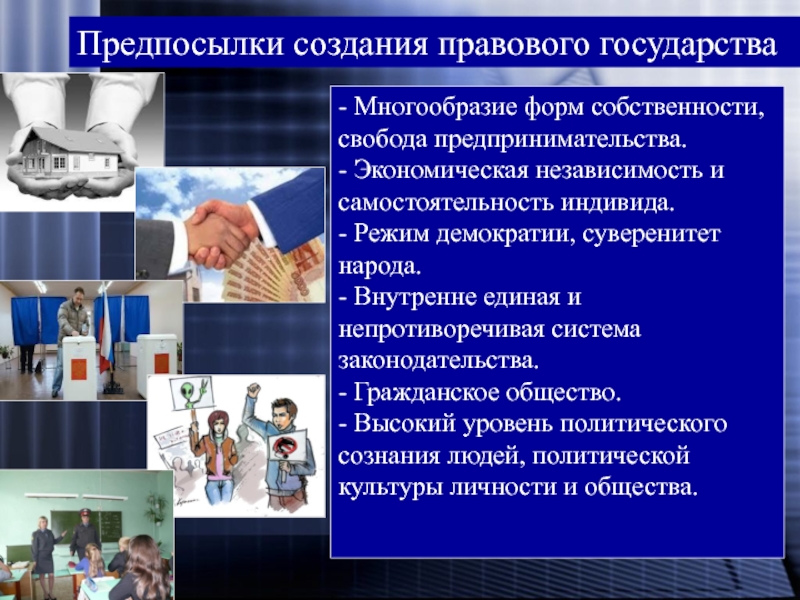 - Высокий уровень политического сознания людей, политической культуры личности и общества.