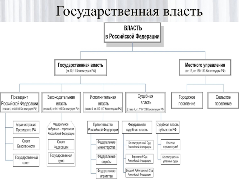 С помощью разделения властей государство организуется и функционирует в правовом режиме: государственные органы действуют в рамках своей компетенции, не подменяя друг друга: устанавливается взаимный контроль, сбалансированность, равновесие во взаимоотношениях государственных органов, осуществляющих законодательную, исполнительную и судебную власть.