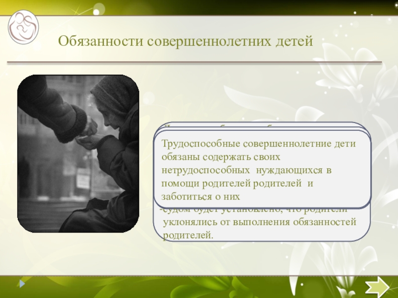 Трудоспособные совершеннолетние дети обязаны содержать своих нетрудоспособных нуждающихся в помощи родителей родителей и заботиться о них