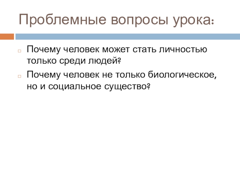 Проблемные вопросы урока:Почему человек может стать личностью только среди людей?Почему человек не только биологическое, но и социальное