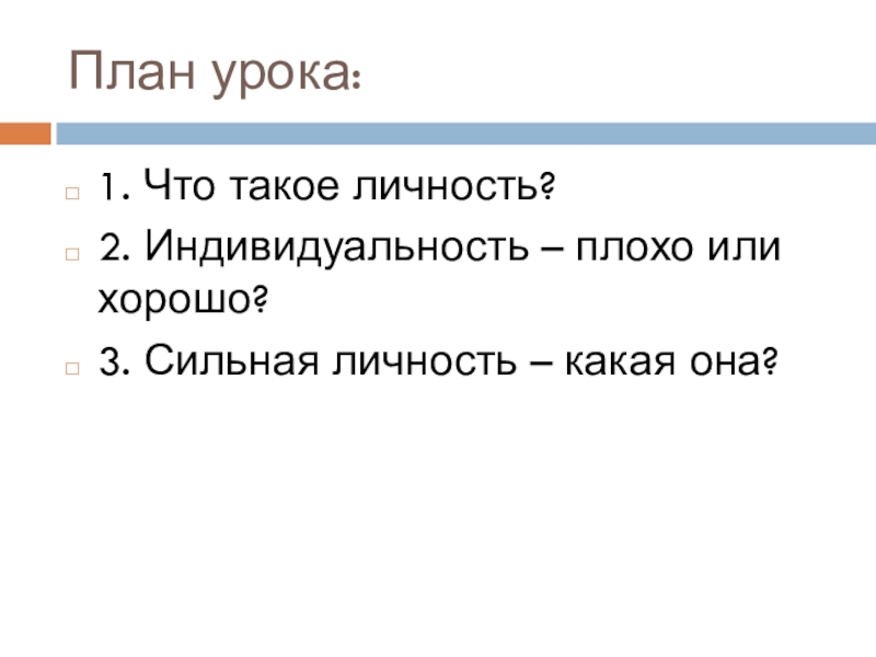 План урока:1. Что такое личность?2. Индивидуальность – плохо или хорошо?3. Сильная личность – какая она?