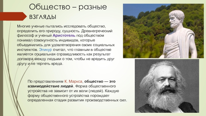 По представлениям К. Маркса, общество — это взаимодействие людей. Форма общественного устройства не зависит от их воли (людей). Каждую форму общественного устройства порождает определенная стадия развития производственных сил.