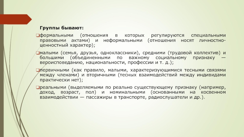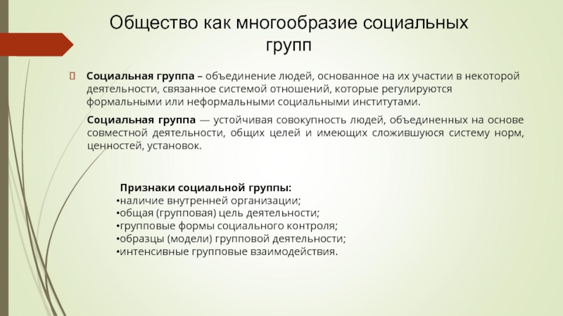 Социальная группа — устойчивая совокупность людей, объединенных на основе совместной деятельности, общих целей и имеющих сложившуюся систему норм, ценностей, установок.