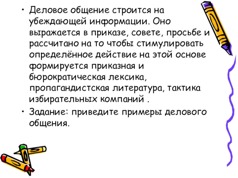 Слайд 2Деловое общение строится на убеждающей информации. Оно выражается в приказе, совете,