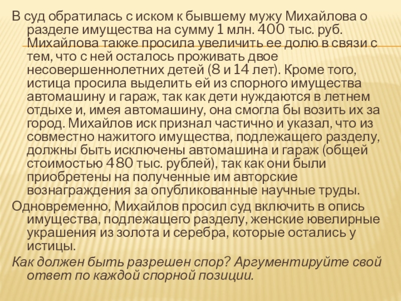 Слайд 12В суд обратилась с иском к бывшему мужу Михайлова о разделе