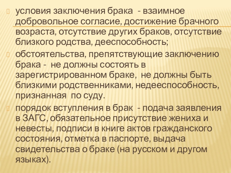Слайд 6условия заключения брака - взаимное добровольное согласие, достижение брачного возраста, отсутствие