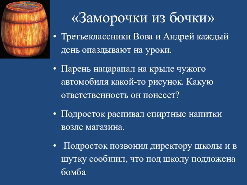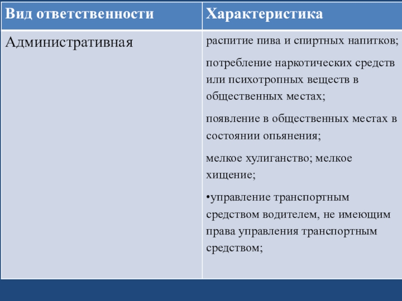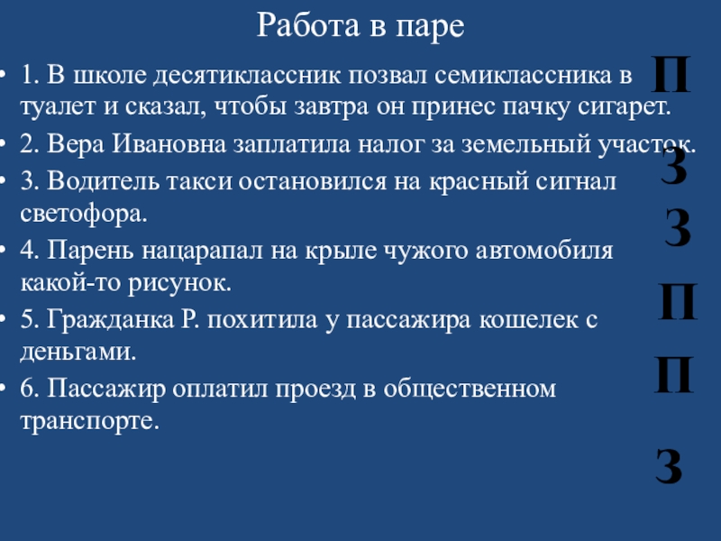 нецензурная брань в общественных местах, нарушение ПДД, опоздание на работу (прогул), порча чужого имущества, безбилетный проезд в общественном транспорте и т.д.