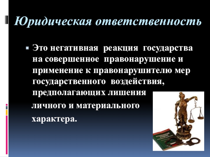 Юридическая ответственностьЭто негативная реакция государства на совершенное правонарушение и применение к правонарушителю мер государственного воздействия, предполагающих лишения личного и материального характера.