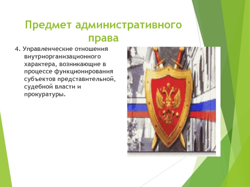 Предмет административного права4. Управленческие отношения внутриорганизационного характера, возникающие в процессе функционирования субъектов представительной, судебной власти и прокуратуры.