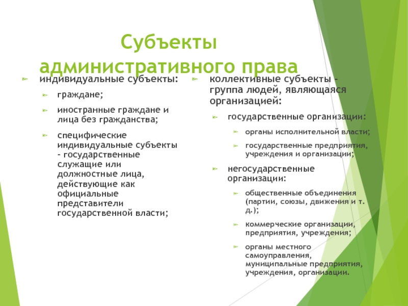 Субъекты административного праваиндивидуальные субъекты: граждане; иностранные граждане и лица без гражданства; специфические индивидуальные субъекты - государственные служащие