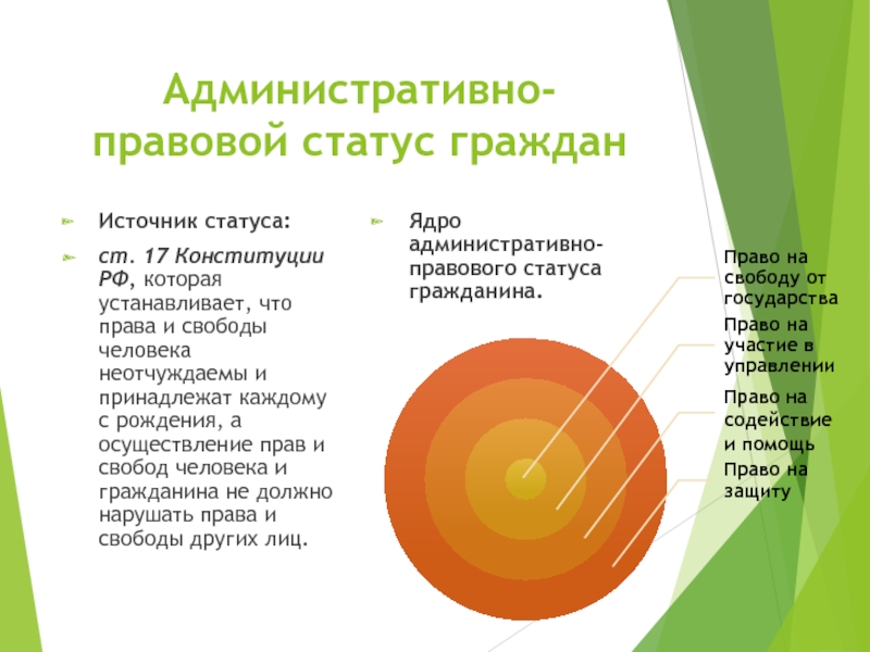 Административно-правовой статус гражданИсточник статуса:ст. 17 Конституции РФ, которая устанавливает, что права и свободы человека неотчуждаемы и принадлежат