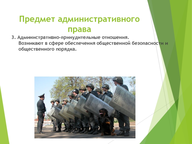 Предмет административного права3. Административно-принудительные отношения. Возникают в сфере обеспечения общественной безопасности и общественного порядка.