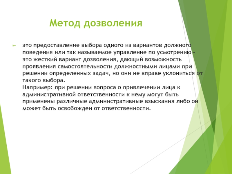 Метод дозволенияэто предоставление выбора одного из вариантов должного поведения или так называемое управление по усмотрению – это