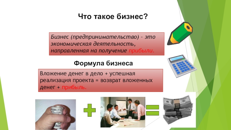 Вложение денег в дело + успешная реализация проекта = возврат вложенных денег + прибыль.