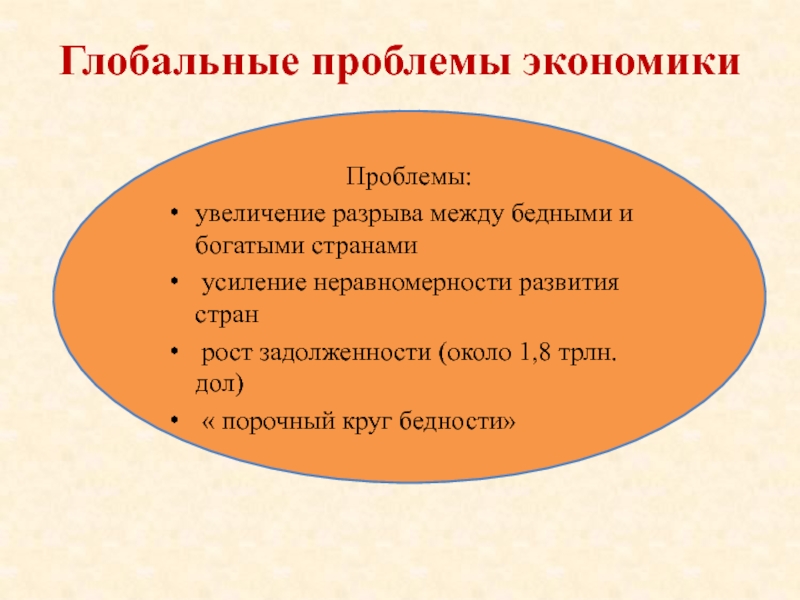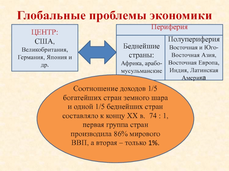 Соотношение доходов 1/5 богатейших стран земного шара и одной 1/5 беднейших стран составляло к концу XX в. 74 : 1, первая группа стран производила 86% мирового ВВП, а вторая – только 1%.