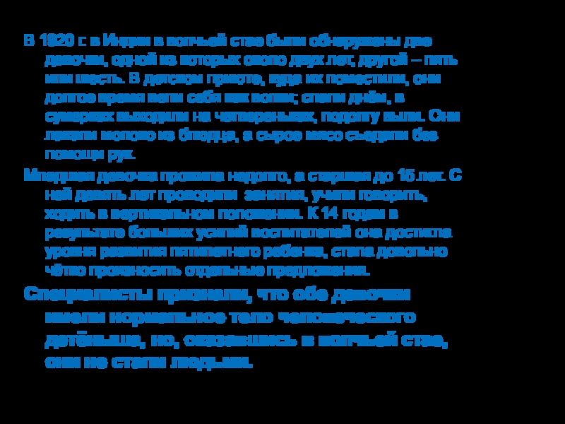 девочки, одной из которых около двух лет, другой – пять или шесть. В детском приюте, куда их поместили, они долгое время вели себя как волки; спали днём, в сумерках выходили на четвереньках, подолгу выли. Они лакали молоко из блюдца, а сырое мясо съедали без помощи рук.