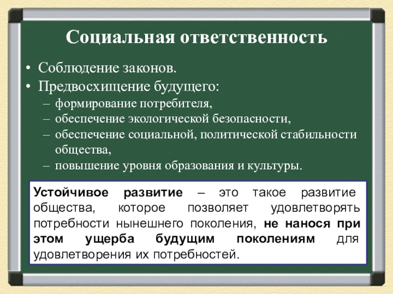 Устойчивое развитие – это такое развитие общества, которое позволяет удовлетворять потребности нынешнего поколения, не нанося при этом ущерба будущим поколениям для удовлетворения их потребностей.
