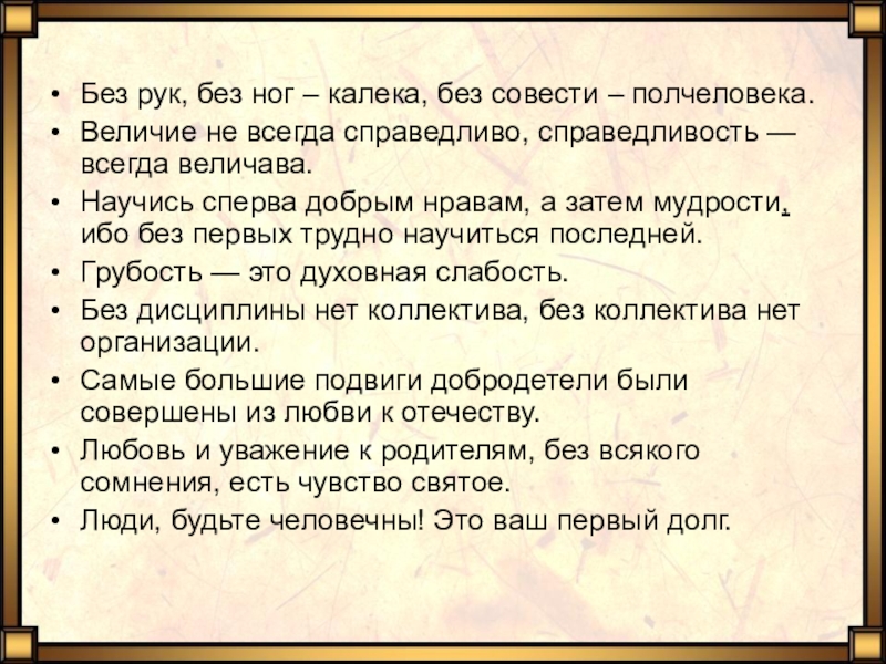 Слайд 4Без рук, без ног – калека, без совести – полчеловека.