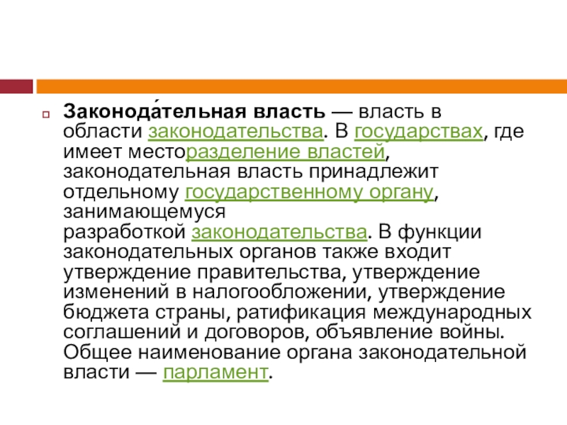 Слайд 4Законода́тельная власть — власть в области законодательства. В государствах, где имеет месторазделение властей, законодательная