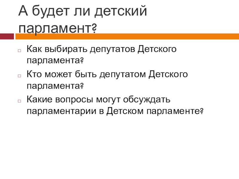 А будет ли детский парламент?Как выбирать депутатов Детского парламента?Кто может быть депутатом Детского парламента?Какие вопросы могут обсуждать