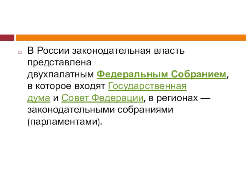 В России законодательная власть представлена двухпалатным Федеральным Собранием, в которое входят Государственная дума и Совет Федерации, в регионах — законодательными собраниями (парламентами).