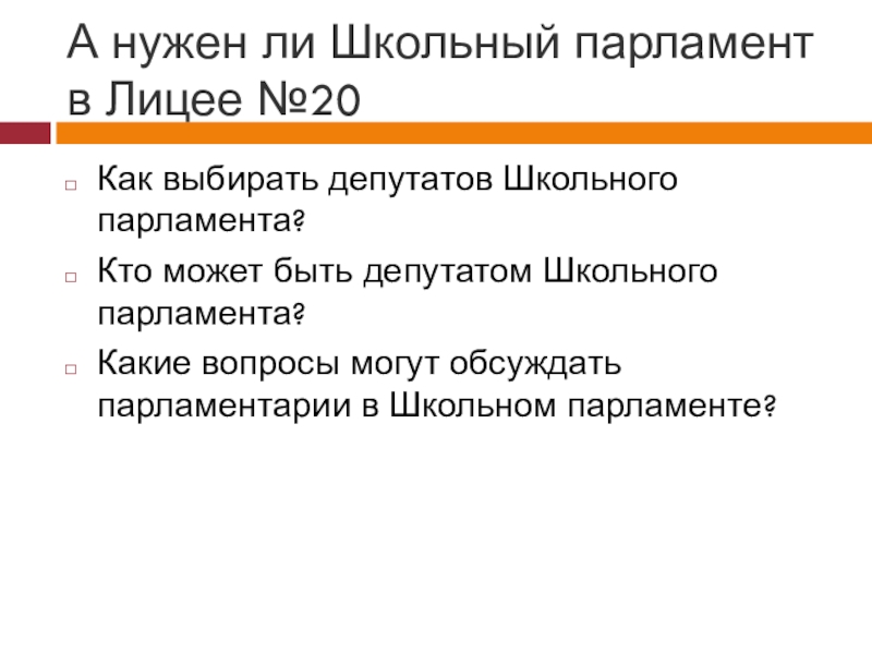 А нужен ли Школьный парламент в Лицее №20Как выбирать депутатов Школьного парламента?Кто может быть депутатом Школьного парламента?Какие
