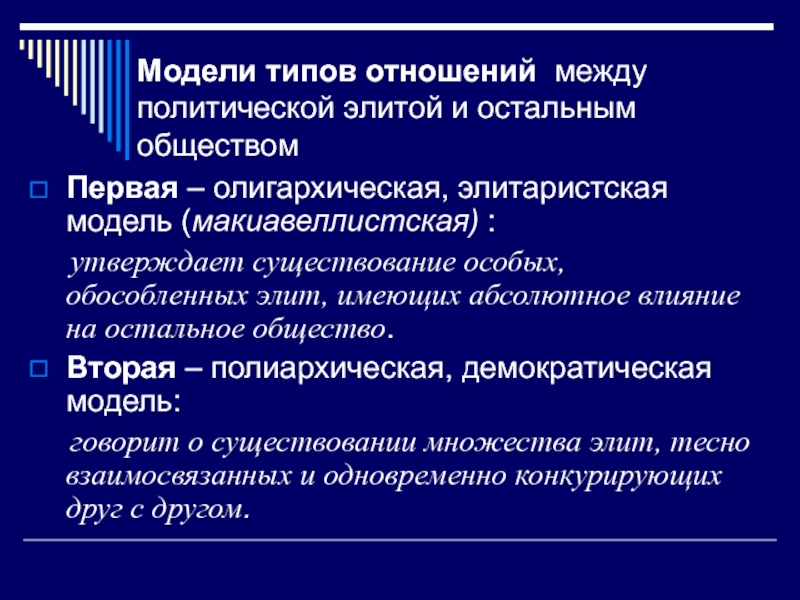 Слайд 6Модели типов отношений между политической элитой и остальным обществом