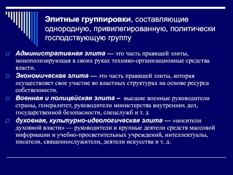Слайд 10Элитные группировки, составляющие однородную, привилегированную, политически господствующую группу