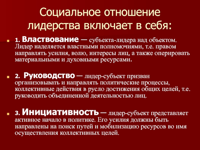 2. Руководство — лидер-субъект призван организовывать и направлять политические процессы, коллективные действия в русло достижения общих целей, т.е. руководить объединенной деятельностью лиц.