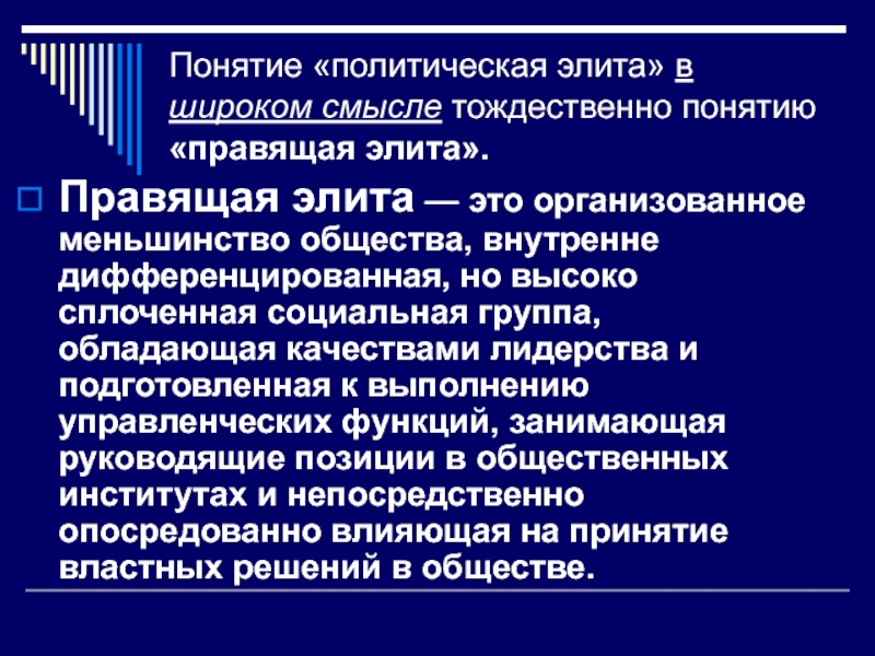 — это организованное меньшинство общества, внутренне дифференцированная, но высоко сплоченная социальная группа, обладающая качествами лидерства и подготовленная к выполнению управленческих функций, занимающая руководящие позиции в общественных институтах и непосредственно опосредованно влияющая на принятие властных решений в обществе.