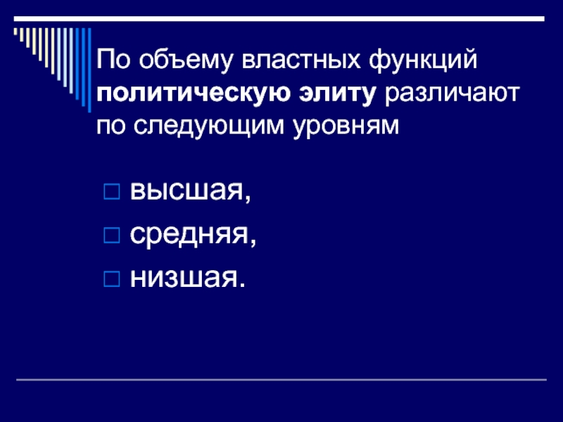 Слайд 9По объему властных функций политическую элиту различают по следующим уровням